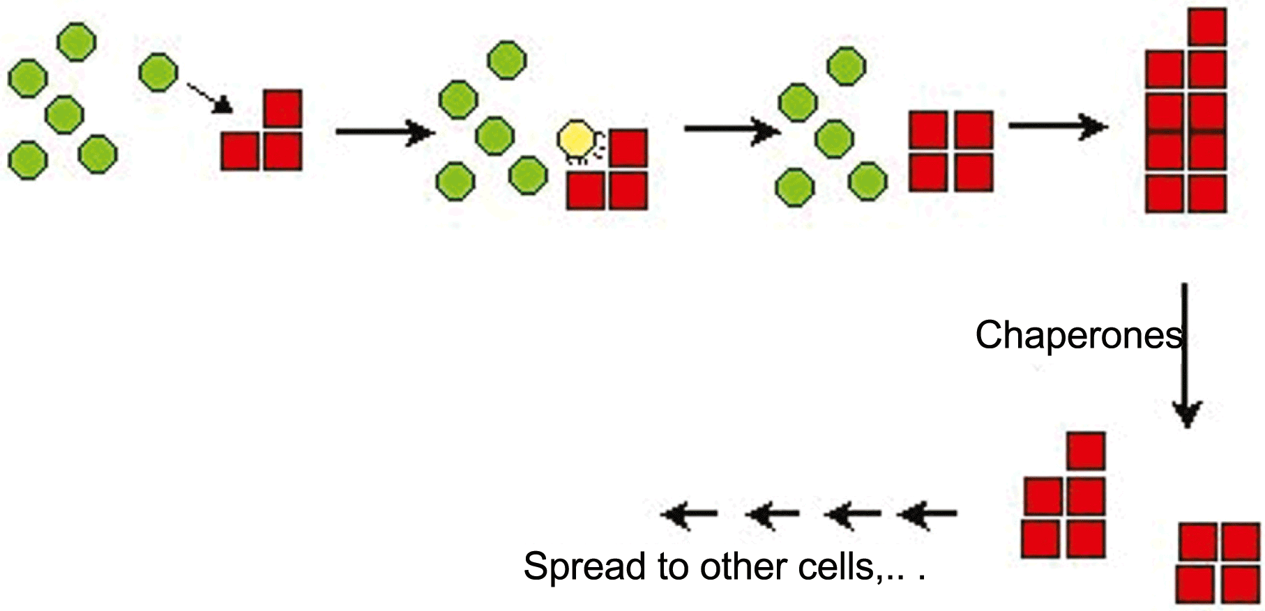 Figure 3 Amyloid prions replicate by elongation of amyloid filaments and scission of filaments by the action of chaperones to produce new filaments.
