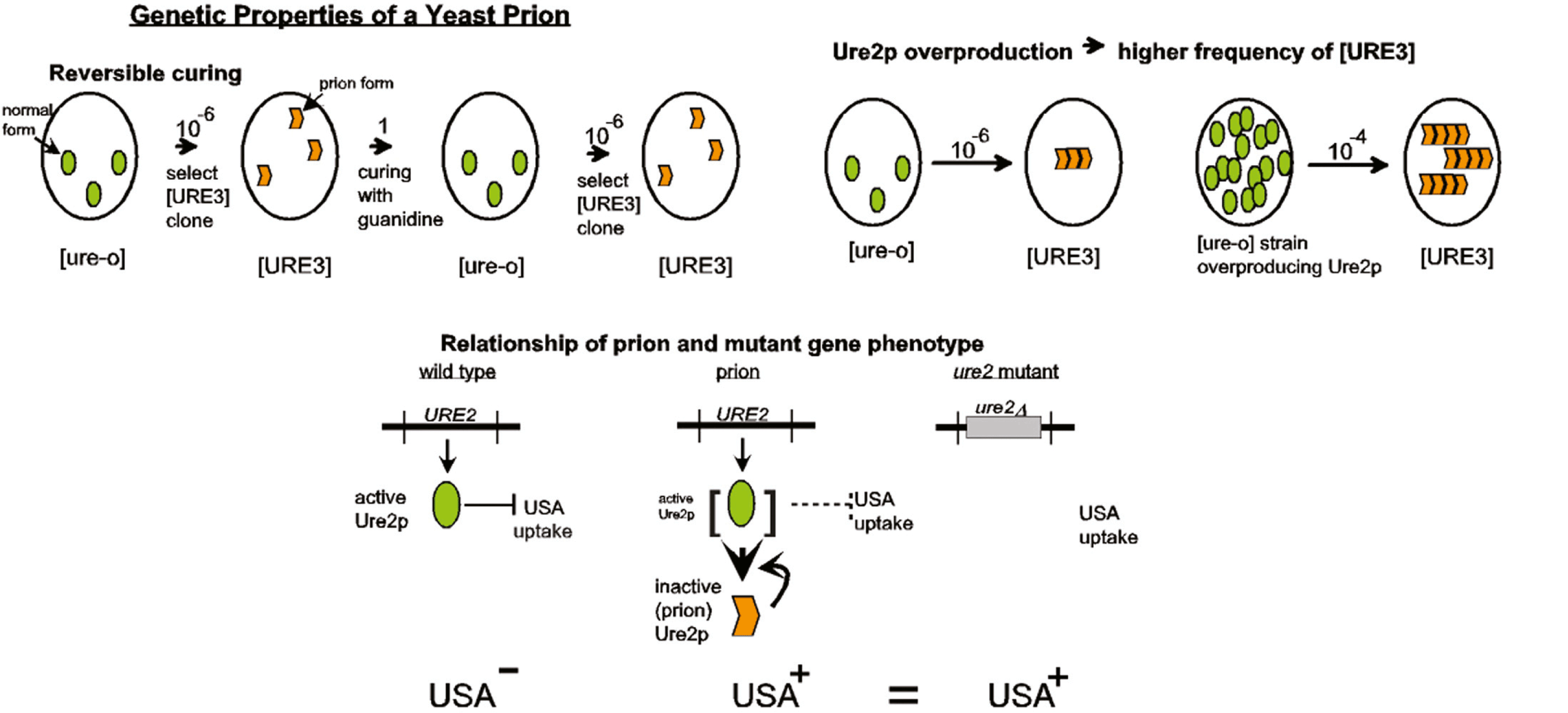 [URE3] makes cells able to take up ureidosuccinate from the media containing a good nitrogen source such as ammonia or glutamine. The ure2 mutants have the same phenotype, and the propagation of [URE3] requires the URE2 gene. Yeast cells turn off transcription of genes for enzymes involved in utilization of poor nitrogen sources when a good nitrogen source is available (nitrogen catabolite regulation). DAL5 encodes the permease for allantoate, a poor, but usable, nitrogen source for yeast. DAL5 is thus subject to nitrogen catabolite regulation. Allantoate is structurally similar to ureidosuccinate, and so Dal5p can take up ureidosuccinate. Ureidosuccinate is an intermediate in uracil biosynthesis, the product of the first step in the pathway, aspartate transcarbamylase (URA2). Thus, ura2 mutants can grow on ureidosuccinate in place of uracil if the cell has either the [URE3] prion or a mutation in ure2. [URE3] can be cured by growth in the presence of 5 mM guanidine HCl.